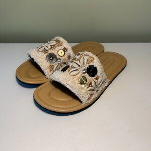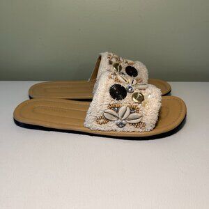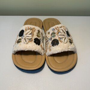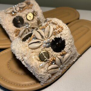 So bold and beachy, these sandals feature a wide strap and easy slip-on style with embellished detailing and shell adornments.