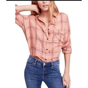 Free People Shirt Womens M Peach 100% Linen Plaid Button Down Coastal Beach
