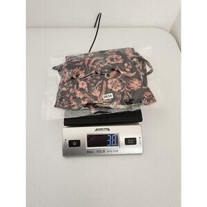 Color: Black base with pink and peach floral print and black lace trim at neckline, waist and sleeve hems.