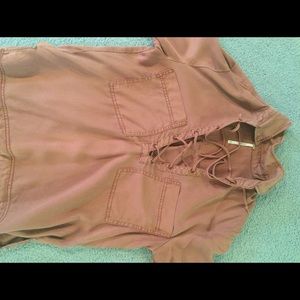 Orangish Brown shade. Free People shirt with lace front. Never worn once in mint condition! Size XS but it runs big so it can be worn if you're a medium build like myself! Great item for fall, and spring due to the color scheme. Looks amazing with a pair of jeans or leggings. Dressed up or dressed down it looks great for all body shapes in my opinion.