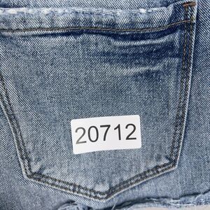 Condition: Good used condition. Denim is intentionally distressed at hem, with minor signs of overall wear and visible fraying, but no holes or major flaws.