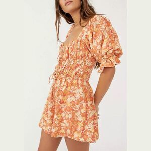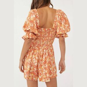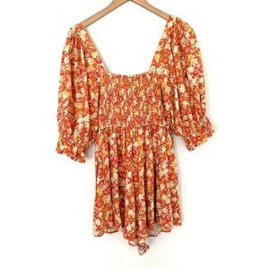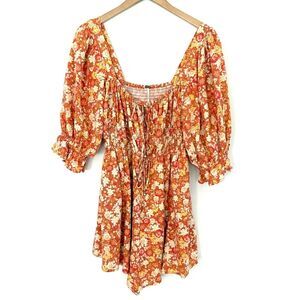 The Show Me Love Romper by Free People in Orange Combo. Pull-on styling with elastic waistband. Dual front tie closure with gold-tone bead ends. Smocked back panel. Blouson sleeves with elastic cuffs. Side seam pockets. Gently worn with no flaws.