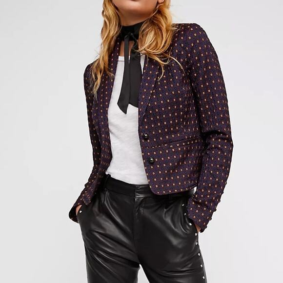 Free People Shrunken Jacquard Jacket Blazer Navy Maroon Geometric SMALL