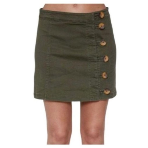Free People mini skirt • army green skirt • side button skirt • cotton blend mini skirt • woven skirt • casual mini skirt • button up skirt • women’s skirt size 8 • trendy mini skirt • cute everyday skirt