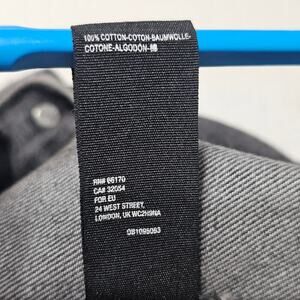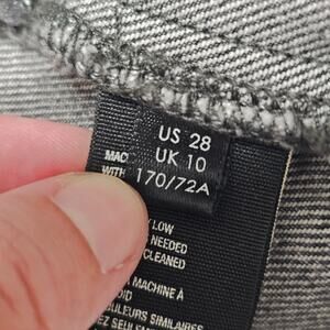 Black denim mini skirt with a frayed notched hem, pockets, and distressed details. Size S. EUC.