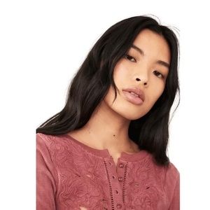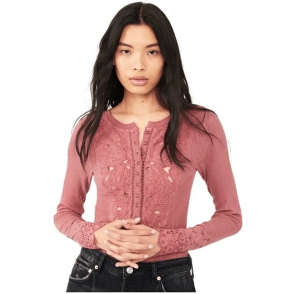 Embroidered floral detail with cut-out accents. Eyelet lace at cuffs. Lightweight thermal fabric.