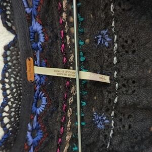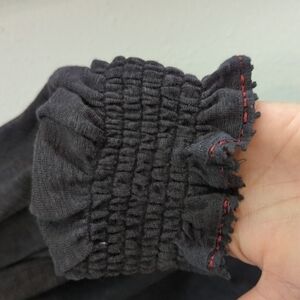 Features: a feisty little flowy black cotton top with colorful embroidery. Eyelet lace trim with flowy silhouette. Button placket. Smocked cuffs. Style with jeans of leggings for a fun boho look Material: polyester/rayon/cotton