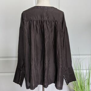 Free People Silk Blouse Button Front Long Sleeve Shirred Oversized Black M NWT