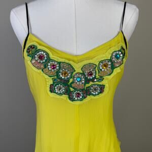 The Free People Silk Dress embodies bohemian glamour with its luxurious crinkle fabric and dazzling rhinestone accents. This yellow and green mini features tiered ruffles and a playful silhouette, perfect for special occasions or festival wear. The delicate silk and artisanal details create effortless movement, making it ideal for summer weddings, garden parties, or adding free-spirited elegance to your wardrobe with artistic flair.