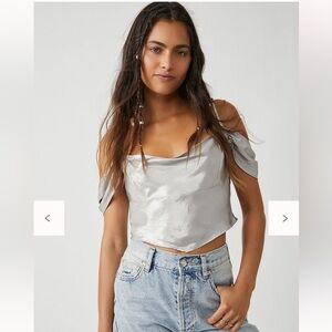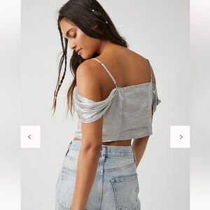 This ethereal silver off-the-shoulder top from Free People is a lowkey celestial goddess moment 🌙✨ Made from a dreamy, light-reflecting satin with a smocked back and adjustable straps for a comfy, sculpted fit. Slight pointed hem adds a modern edge to the romantic vibe.