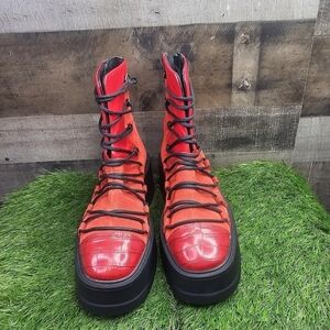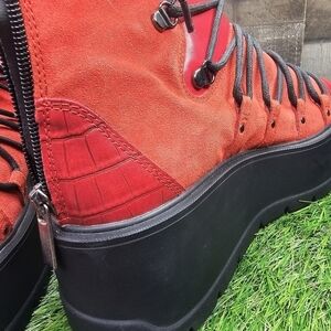 Standout in these seriously edgy and eye-catching boots featured in a buttery soft leather and pull-on style with a military-inspired D-ring lace-up, drawstring cord closure, and chunky wedge sole.