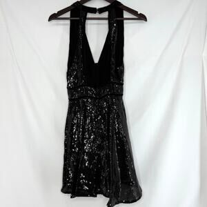 Free People Size 4 Black Sequin Halter Dress Velvet Trim Open Back Holiday Party