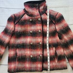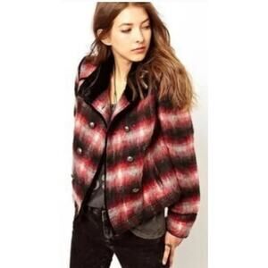 Free People Size EST S Red Wool Jacket Plaid Military Black Velvet Trim Double Breasted