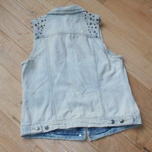 Free People Size Large, distressed throughout, studded, sleeveless Jean Jacket. No tags, never worn. Light wash, with side pockets, and front button top pockets.