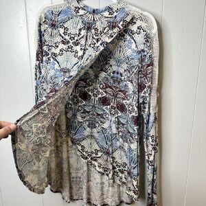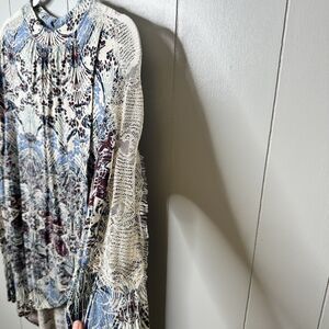 Style Profile: Lace, Paisley, Floral, Boho, Peasant, Bohemian, Mock neckline, button keyhole closer in the back, lightweight, long sleeve, wrap in front.