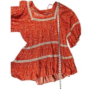 Free People Size Large Orange Boho Print Tunic Top Blouse W Ivory Crochet Trim