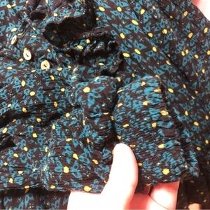 Free People Size Small Sunshine peasant top. This top is loose and flows with a lightweight design. Made of 100% rayon. This top is beautiful with vibrant blues and yellows. Full length sleeves with eleastic atriums the wrists. This dress is perfect with a business meeting or going to a wine bar with friends.