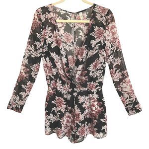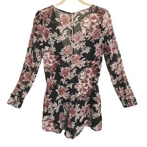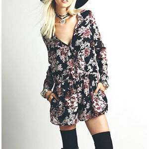Free People Size XS Romper Floral "Float Away" Long Sleeve Black Floral Multi