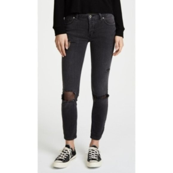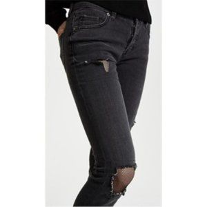 Distressed jeans with fishnet peeking through add a flirty edge to your outfit.