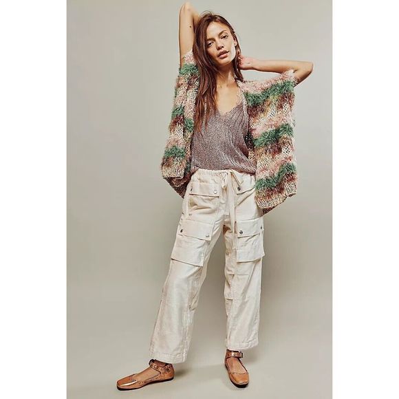 Features: Pull-on design, drawstring waist feature, oversized workwear pockets, metallic sheen fabrication