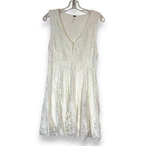 Gorgeous Free People ivory lace sleeveless mini dress featuring a stunning sheer embroidered overlay, deep V-neckline, and open illusion back. Feminine and flattering fit-and-flare silhouette perfect for bridal showers, parties, or boho festivals.