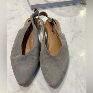Free People Suede Slingback Pointy Toe Flats. Size 39. Made in Spain. Beige / gray color. Good preowned condition.