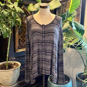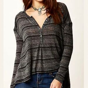 Free People slinky Hacci Striped Henley Gray Black. Light weight sweater top. Very oversized. Measurements approximate lay flat