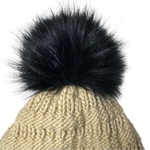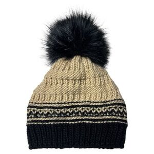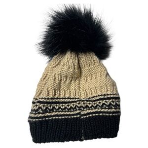 Free People Slope Stripe Pom Pom Beanie Hat In Black And Cream NWT One Size