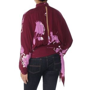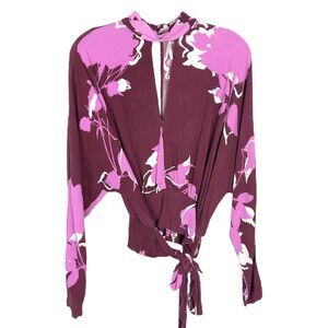 Free People Small Top Burgundy Floral Mock Neck Long Sleeve Choker V Neck 1043
