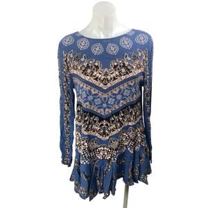 Free People Smooth Talker Blue Floral Long Sleeve Boho Mini Tunic Dress Size S