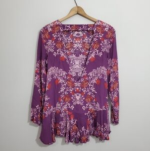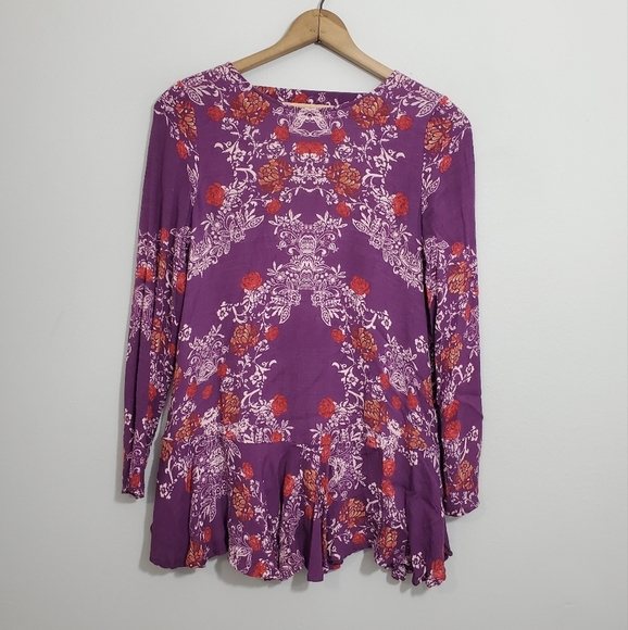 Pre-owned Free People Smooth Talker tunic top, size small. It's made of a viscose/rayon blend fabric that's lightweight with no stretch, has an open V back, 2 side pockets, and it comes in a beautiful floral print. It's in excellent condition, no stains, rips, etc.