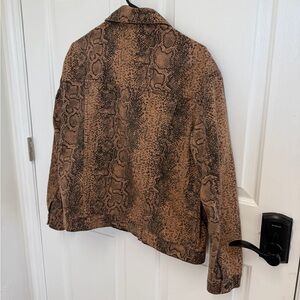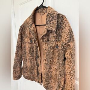 Free People snakeskin-print denim jacket in a brown and black wash. Structured yet soft denim with a relaxed, slightly oversized fit — an easy statement layer for any season.