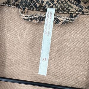 This is a Free People Trucker Denim Jacket in size XS with a snakeskin print in brown. It has a button closure and is made of cotton denim fabric. This jacket is designed for women and falls under the category of clothing, specifically coats and jackets.