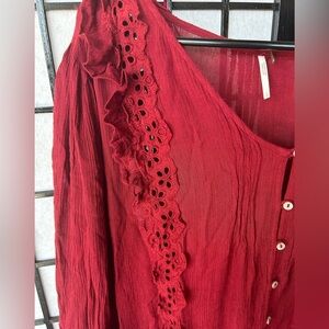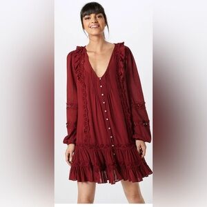 Free People Dress “Snow Angel Mini” – a very pretty short shapeless burgundy dress featuring eyelet design, V-neck, pintuck detailing, long full sleeves, in boho chic style! Light weight fabric, removable underneath slip (with adjustable straps), easy comfortable fit. Gorgeous dress, indeed!