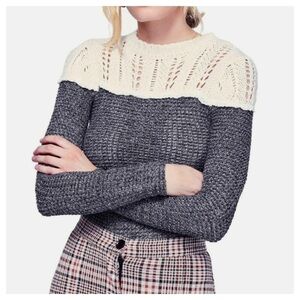 Free People “Snowflake Swit Top” – a very unique charcoal grey knitted top featuring crochet-like sweater design at neckline, long sleeves, rounded hemline, stretchy. Wear it as a top or as a pullover. Fits true to size. One of a kind style, indeed!