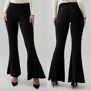 Rock a flattering silhouette in these high-waist pants textured in rich velvet with dramatic flared hems.
