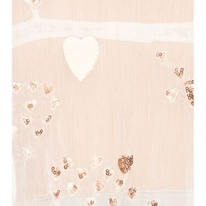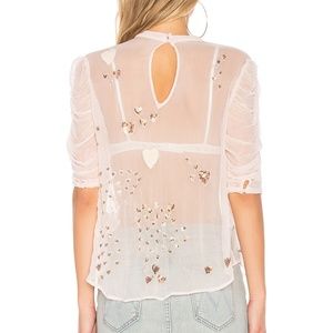 Crinkly chiffon sheer blouse featuring super sweet embroidery and sequin detailing.