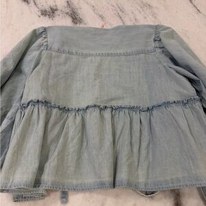 Chic denim jacket in soft blue. Features a stylish design with a tie front. See measurements. Super cute fit especially paired with skinny pants.