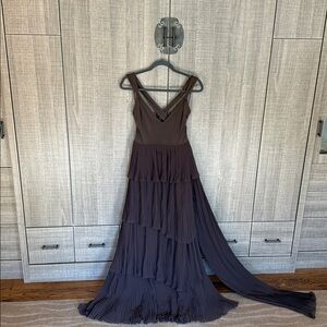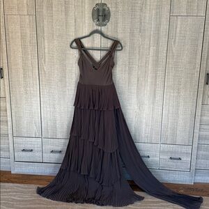 Features: V-neckline, strappy back detail, defined tie at waist, tiered skirt, pleating throughout