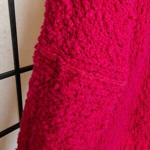 Cute Free People Songbird chunky bouclé knit pullover slouchy style sweater. Raglan sleeves, wide V-neck. Exposed seams. Bright hot pink color. Fits oversized. Some stretch and loose knit.