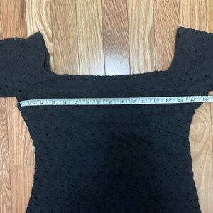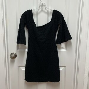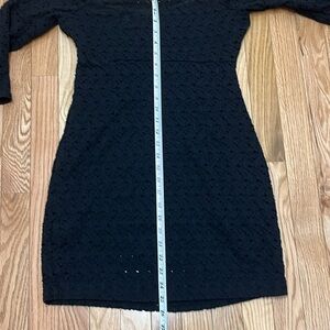 Black Mini Dress Lacey like crochet and Eyelet. 3/4 Bell Sleeves. Hidden side zip. 66% Cotton, 33% Nylon, 1% Spandex. please note the original dress came with removable straps, but i no longer have them.