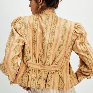 Taking notes from Victorian styles, this charming jacket is featured in the most gorgeous floral striped pattern with round antique-inspired buttons, puff sleeves, and a stand collar. Great Condition. This coat is like a vintage art piece. I first bought it in Golden haze combo and love it so much! The color, patterns, and details are all exquisitely crafted, especially the antique bronze metal buttons, which add a retro charm and a touch of playful design. It’s still stunning—this coat is clearly meticulously designed with great care.