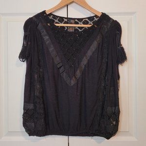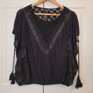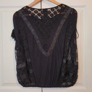 Free People New Romantics black top. Loose-fitting. Embroidered mesh and lace details on chest, back and side panels. Dual tassels on sleeves - can be let down for looser sleeves or tied up tight for a more sleeveless look. Stretchy waistband. Bohemian vibe.