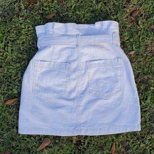 A super cute oatmeal-colored skirt with a scrunch, paper waist, or paper bag waist.