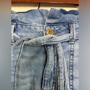 High ruffled waistline. Button and zipper closure with denim belt sash. Front and back pockets. Light/medium wash with manufactured fading.