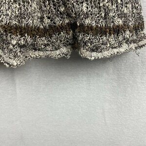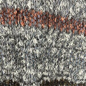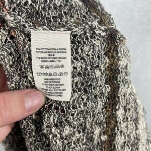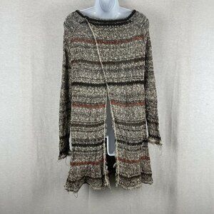 Free people crotchet / open knit long sleeve tunic. This has a split back with fringe. There are a few pulls throughout and a little extra fraying but it really just adds to the distressed look. Size small. Tan, brown and orange striped top.