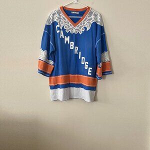 Features: Thick jersey fabrication, wide, drop-shoulder ¾ length sleeves, V-neckline, contrast seams, sporty graphics, lace inlays