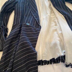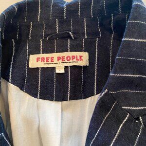 Free People Stella Blue Striped Blazer. This fun blazer has a peplum waist and is fully lined with a gathered tie cuff detail. Fringe bottom. Excellent condition - worn only once