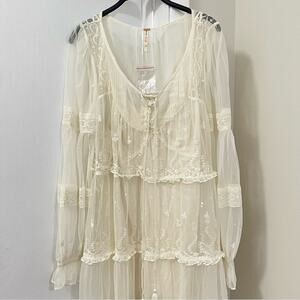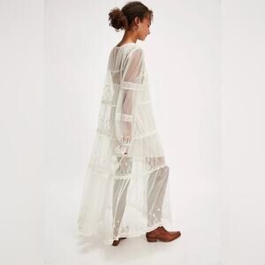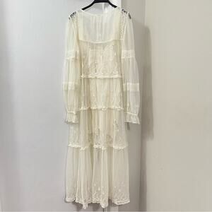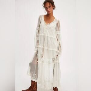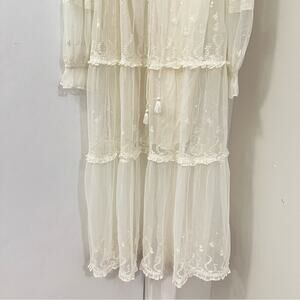 Billowy and beautiful, this maxi features a sheer mesh fabrication and contrast embroidered detail with a low scoop-neckline and balloon sleeves.