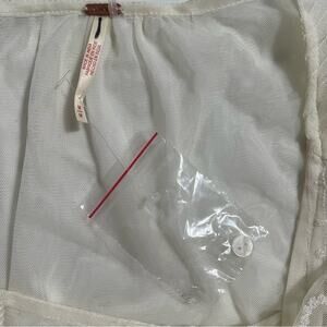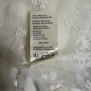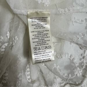 Features: Sheer mesh fabrication, contrast embroidered detail, low scoop-neckline with button closures, ruffled trim throughout, elasticated cuffs at sleeves, separate slip lining